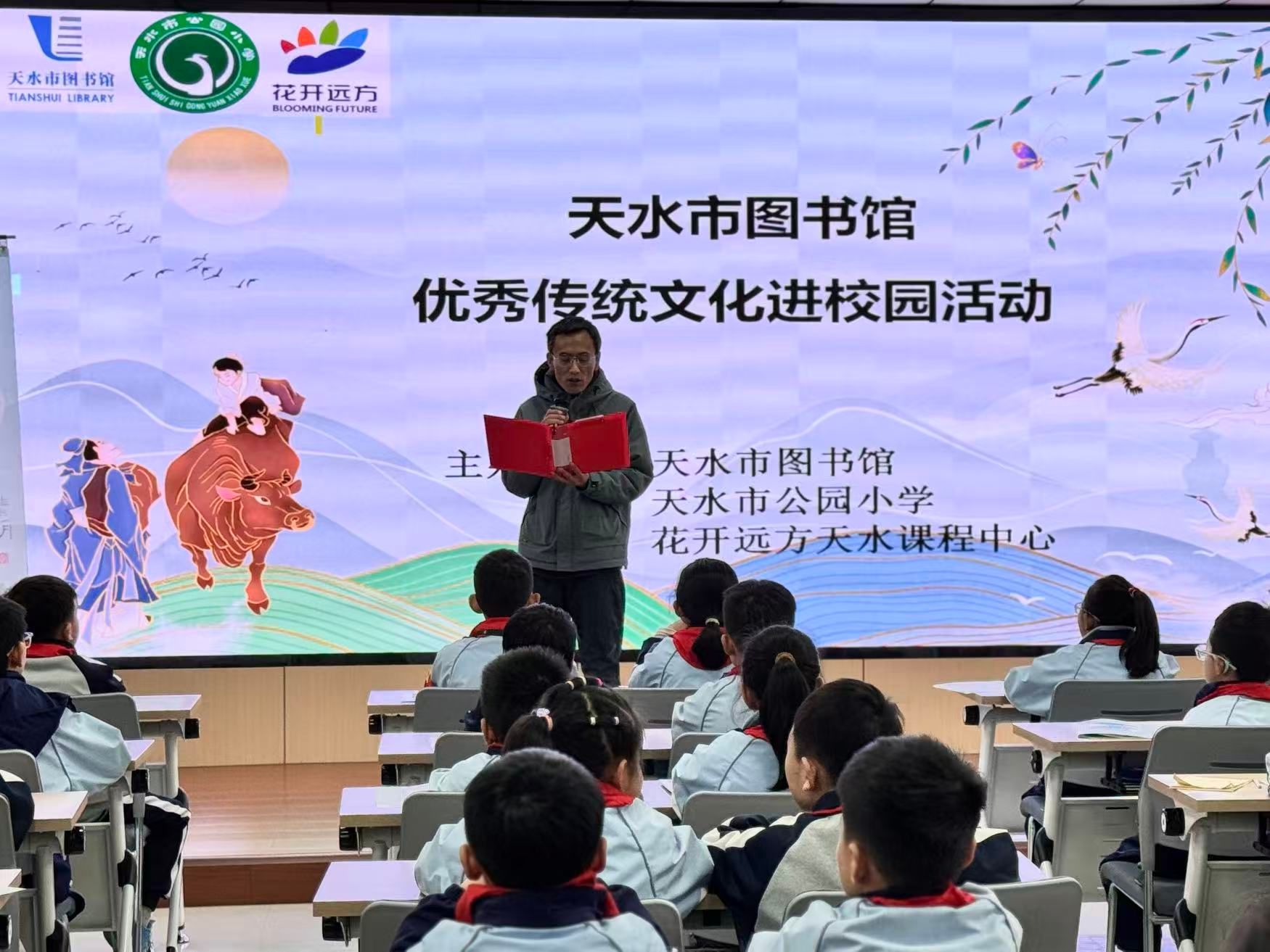 活动开始前,公园小学校长马文礼、天水市图书馆副馆长李东晖为活动致辞。